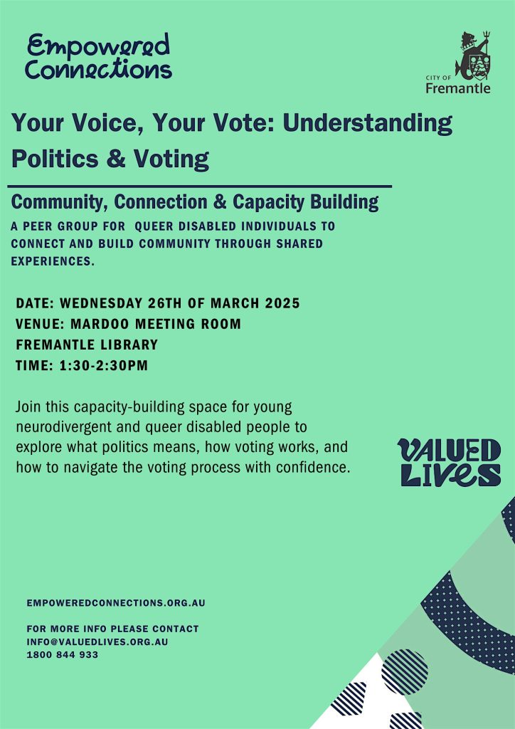 We’d love to welcome you to our first peer group meeting; a capacity-building space for young neurodivergent and queer disabled people to explore what politics means, how voting works, and how to navigate the voting process with confidence.